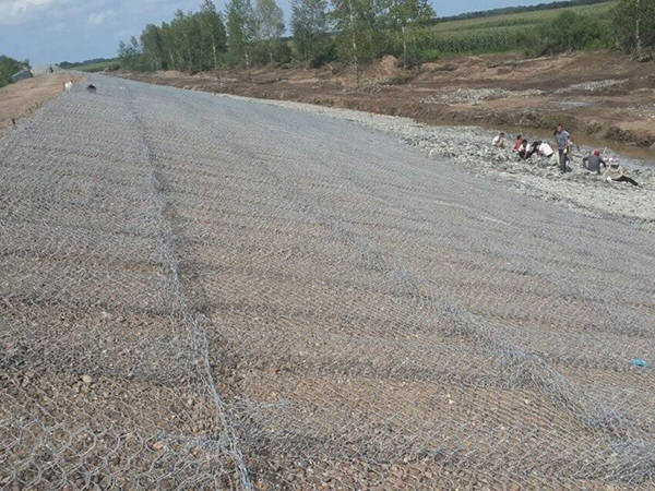 雷諾護(hù)墊也叫石籠護(hù)墊,格賓護(hù)墊,是指由機(jī)編雙絞合六邊形金屬網(wǎng)面構(gòu)成的厚度遠(yuǎn)小于長度和寬度的墊形工程構(gòu)件。雷諾護(hù)墊中裝入塊石等填充料后連接成一體,成為主要用于水利堤防、岸坡等的防沖刷結(jié)構(gòu),具有柔性、對地基適應(yīng)性的優(yōu)點(diǎn)。